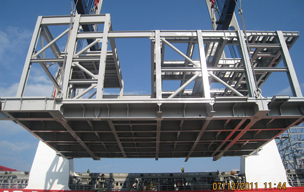 As the scope of TEKFEN Tekfen Manufacturing Ceyhan Facility, structural steels of process modules, Flare Towers, Helideck, Pipe Racks, Spreader Bar and other structures for P58 & P62 FPSO Platforms to be installed at Parque das Baleias and Roncador Offshore Oil Fields in Brazil have been fabricated. In addition, fabrications of process modules for P58 & P62 FPSO at Santos Basin have been performed. Deck segments, Flare Tower steel structures and pipe spool fabricated in Tekfen Manufacturing Ceyhan Facility, have been transported to Iskenderun Port by means of special vehicles, and their assembly have been performed over there at the port. Totally, Process Modules of 6,200 tons in weight have been fabricated and 2 Flare Towers totally 300 tons each, works handed over to customer within the scheduled time. The Weight of the completed process modules changes between 150 and 400 tons. Dimensions of the biggest module was; W: 27 x L: 22 x H: 2 m, and the weight was 400 tons.