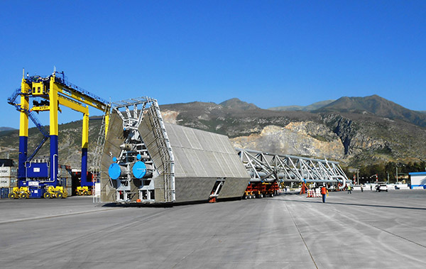 As the scope of TEKFEN Tekfen Manufacturing Ceyhan Facility,, structural steels of process modules, Flare Tower and pipe spools for P74 FPSO Platforms to be installed at Santos Basin Pre-salt Area off-shore, Franco Sul Field in Brazil, have been fabricated. In addition, fabrications of process modules for P74 FPSO at Santos Basin have been performed. Deck segments, Flare Tower including with Heat Shield Panels steel structures and pipe spool fabricated in Tekfen Manufacturing Ceyhan Facility, have been transported to Iskenderun Port by means of special vehicles, and their assembly have been performed over there at the port. Totally, 11 Process Modules of 3,000 tons in weight have been fabricated with legs and Flare Tower totally 340 tons with including process piping which are Duplex / Super Duplex, SS, LTCS, Cu/Ni and CS piping works and Heat Shield Panels handed over to customer within the scheduled time. The Weight of the completed process modules changes between 150 and 310 tons. Dimensions of the biggest module was; W: 29 x L: 22 x H: 4 m, and the weight was 310 tons.